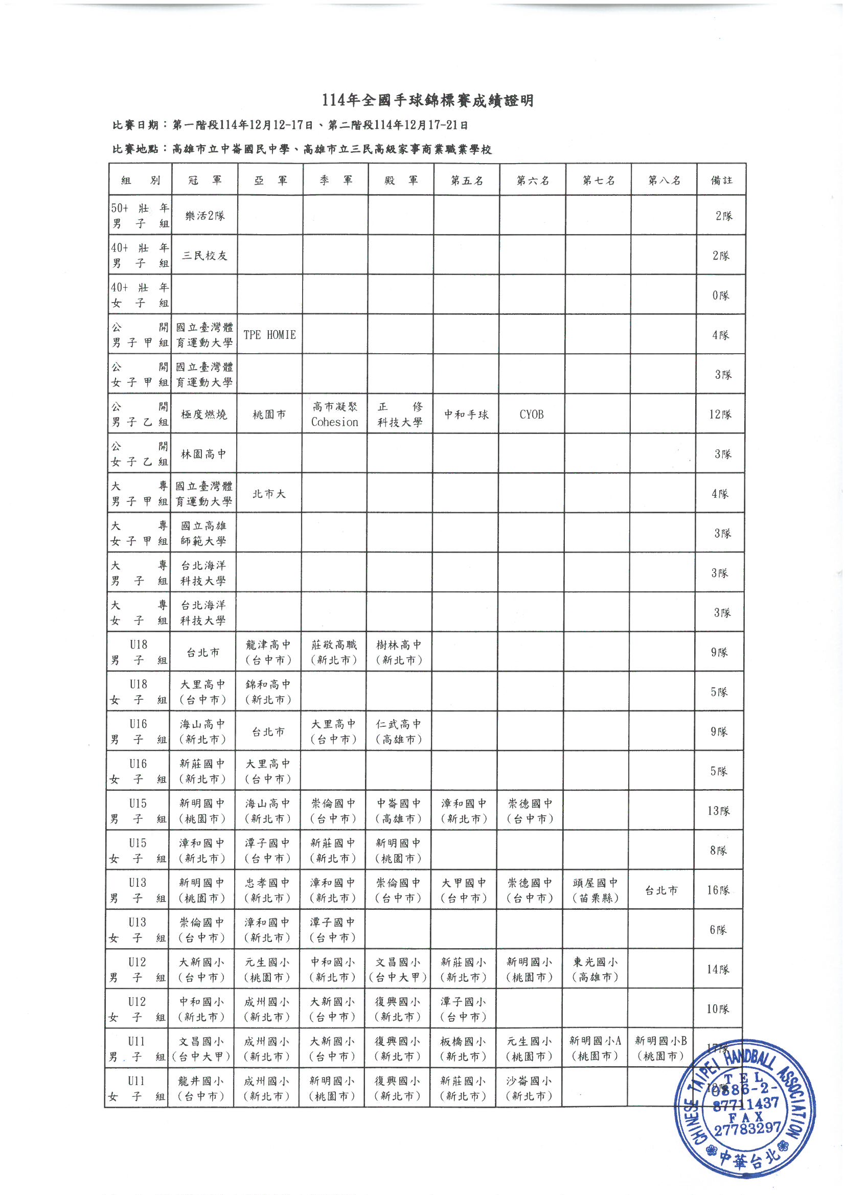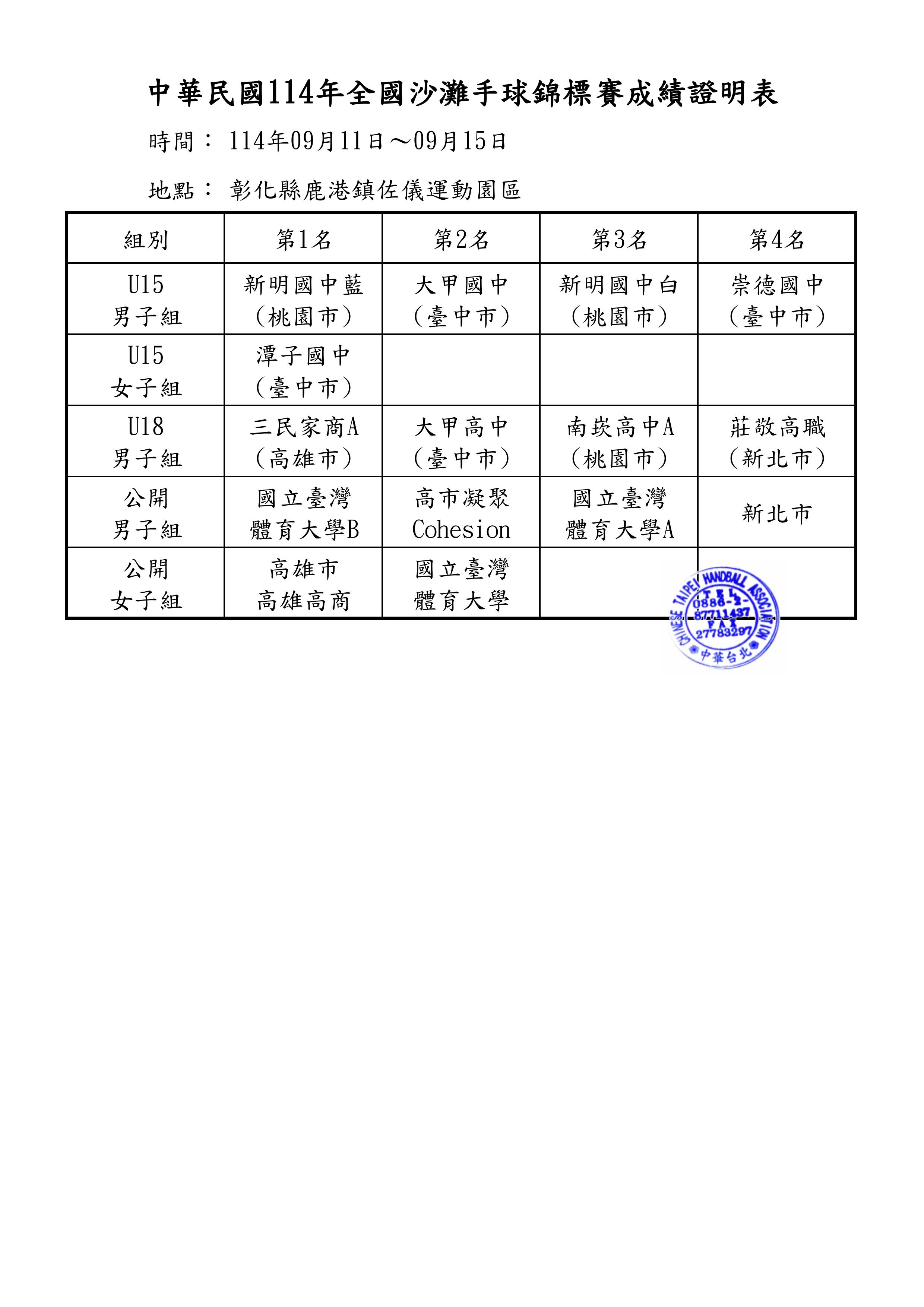 114年全國沙灘手球錦標賽、114年全國手球錦標賽 - 成績一覽表